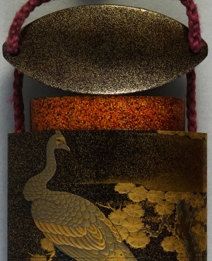 高蒔絵で唐松に孔雀を表しています。