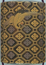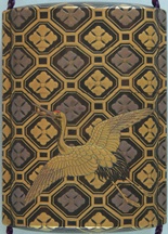 黒柿の木地に、木地蒔絵の手法で蜀江文と瑞鶴文を高蒔絵で表裏に表しています。