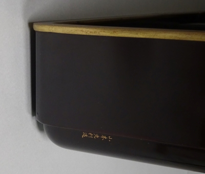 底の丸い角部分に「山本光利造」の蒔絵銘が隠し銘のように小さくあります。