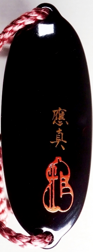 底部右に「應真」の蒔絵銘と朱漆で名の「矩」を瓢箪形に表した描印があります。