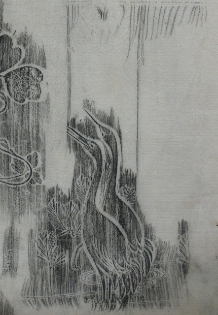 若松の枝や鶴の丹頂には、洗出し技法を使っています。