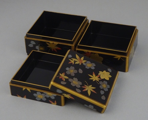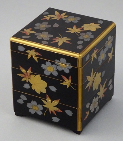 小ぶりな重香合です。全体に桜と紅葉を散らし、愛玩品というにふさわしい作品です。