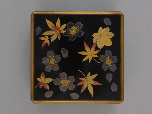総体黒蝋色塗地とし、平蒔絵で、桜は銀粉、紅葉は焼金に青金の蒔き暈しで朱を交えています。